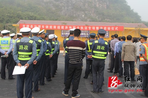 红网双牌站10月23日讯(通讯员 唐娟)10月23日,双牌县在五里牌治超站举行路面治超异地联合执法专项整治启动仪式。双牌县委常委、副县长李长于出席启动仪式,零陵区公路局,县交通、公路、交警、公安等相关人员参加启动仪式。启动仪式上,李长于致辞,他首先感谢零陵区前来参加双牌县异地联合执法的工作人员对双牌治超工作的高度重视和大力支持。他指出,治理车辆超限超载,是省市县各级政府下定决心要坚决抓好的一件大事。开展异地联合执法专项整治行动的目的就是要加大对超限超载运输车辆治理力度,巩固和扩大现有的治超成果,严防违法超限超载运输反弹,确保12月底全县超限率控制在1%以下的目标顺利实现。
