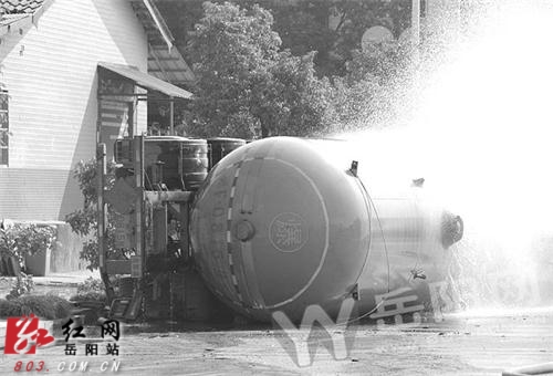 云溪中队指挥员立即协助医务人员将伤者转移到救护车上,并在事故车辆双向设置警戒线,提请交警部门协助在双向进行交通管制,同时在罐体中央处设置一门遥控炮自摆喷雾保护罐体,同时分别向支队指挥中心以及区政府应急办报告事故情况。