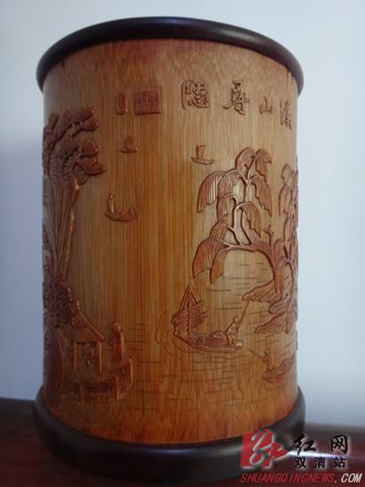 唐朝林创作的荣获铜奖的作品竹青浮雕山水人物笔筒《溪山寻隐》。