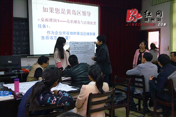 红网靖州站11月7日讯(通讯员 钟欢)“爆炸发生后,最重要的事情当然是抢救受伤群众、进行转移疏散,同时开展管道修复。由于管线众多、情况复杂,还必须组织专家团队进行风险评估和科学论证,防止救援过程中再次发生爆炸。”11月6日,靖州县2015年秋季主体班的“桌面推演”课堂上,县委党校科干班学员们通过“角色扮演”互动形式,模拟“某地输油管道爆炸”后,地方政府如何应对突发事件的过程。老师预先将班级学员分成几个小组,每组选出小组长统筹分工,带领组员集体研商应对方案并配合推演出突发公共事件的现场处置过程,让学员在“角色扮演”的过程中提高处理突发事件的能力。