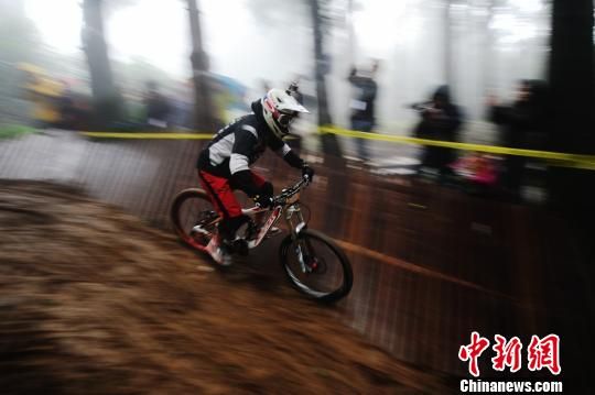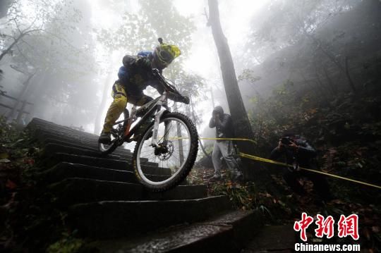 当天,参赛选手依次从黄石寨景区山顶出发,沿近4000级蜿蜒、陡峭的台阶游道速降,再穿越龙凤庵丛林古道抵达终点黄石寨索道下站。整个速降过程中,选手们不仅需要数次急转弯腾空飞越,还要绕开暗沟、荆棘、碎石、树藤等障碍物,并以最快速度抵达终点。经过紧张激烈的角逐,来自台湾的选手江思翰最终以7分44秒的成绩夺得速降赛冠军。
