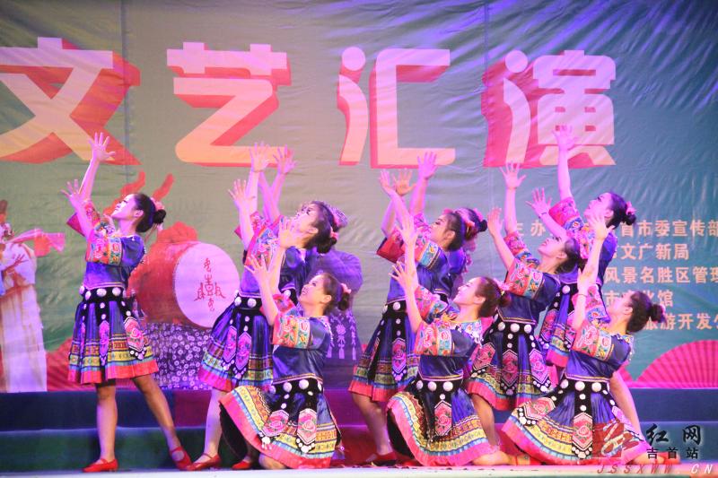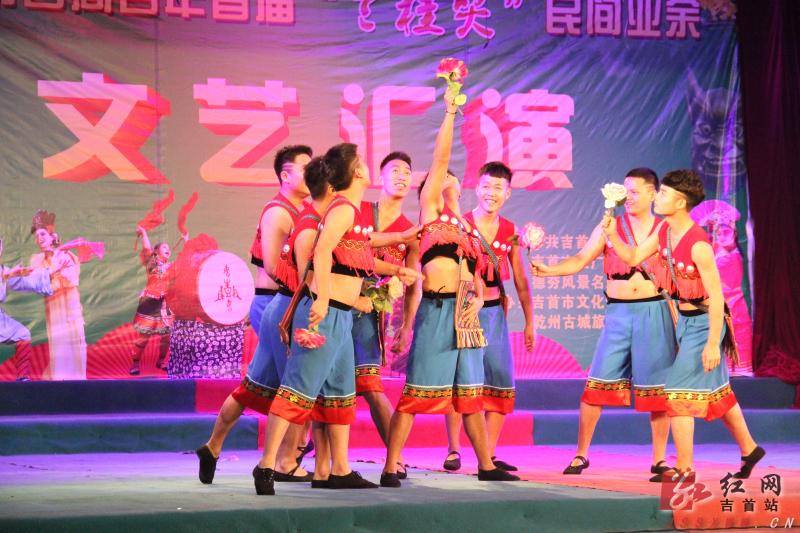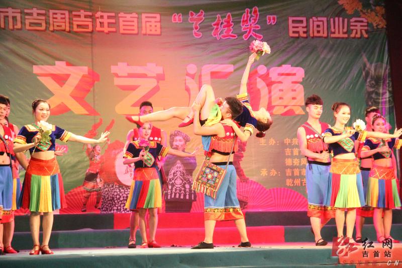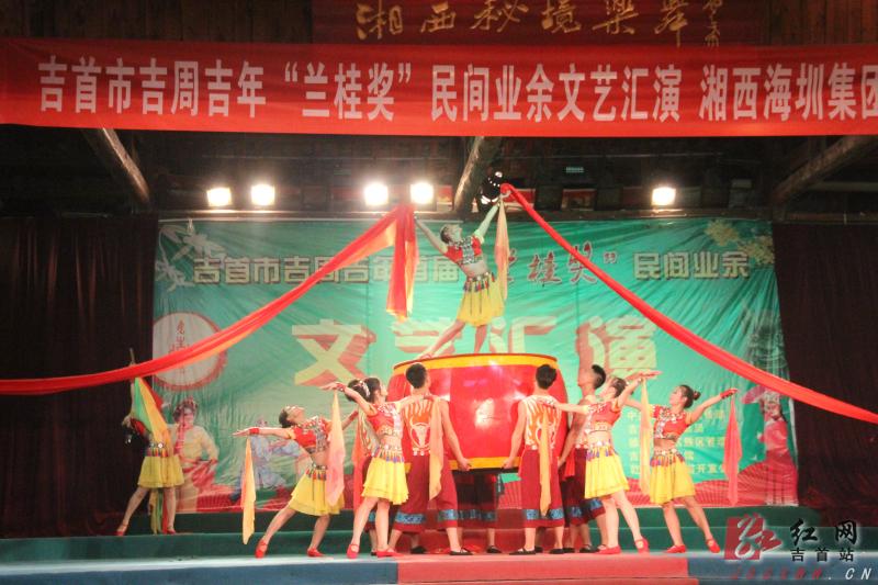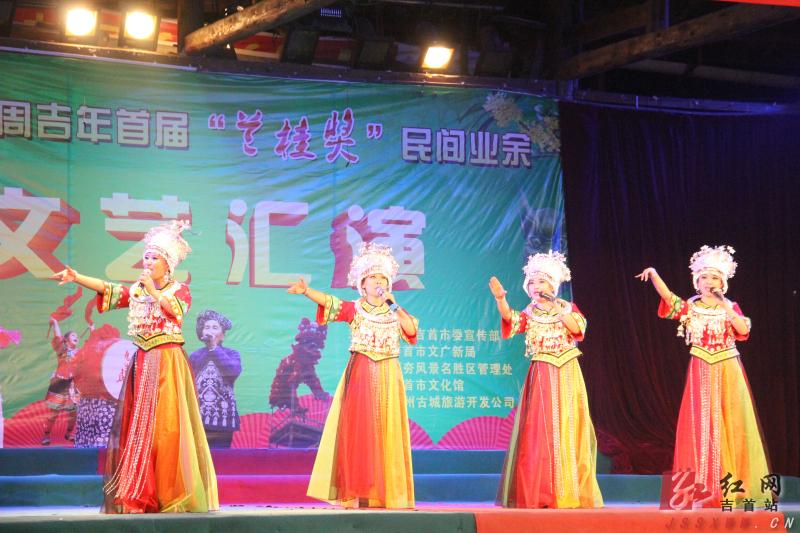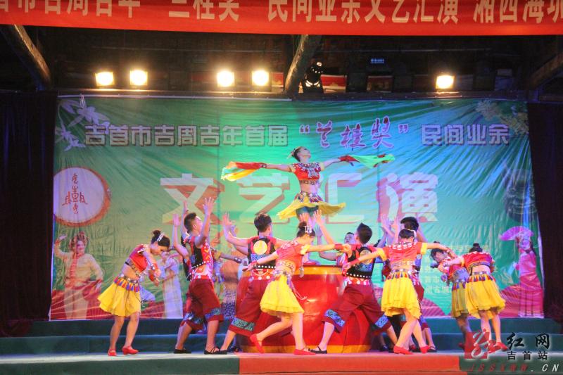 红网吉首站11月9日讯(分站记者 陈和怡) 政府搭台,百姓唱戏。11月5日晚,吉首市吉周吉年“兰桂奖”民间业余文艺汇演在乾州古城巫傩堂拉开序幕。活动旨在鼓励支持业余文艺团体的健康发展,活跃丰富基层广大人民群众的精神文化生活,促进基层文化事业的繁荣发展。当晚,在乾州古城巫傩堂内,市民族艺术团的演员们为大家带来了一个个精彩的歌舞表演节目,吸引不少市民前来观看。
