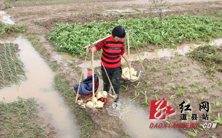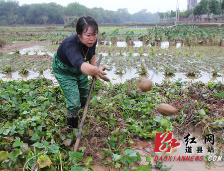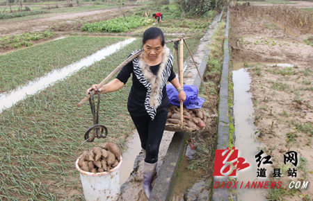 11月15日,道县东门街道东洲社区居民,在洪水退去的菜地里抢收农作物