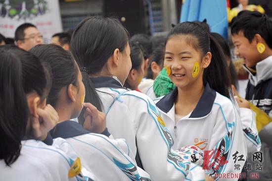 现场学生贴着标签为活动加油。