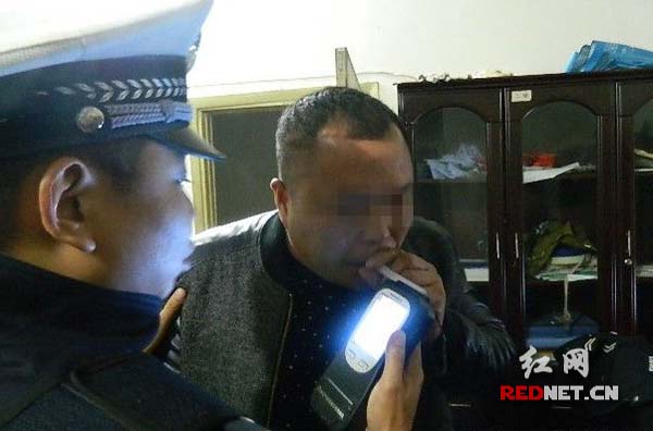 交通违法驾驶人刘某某在接受酒精测试仪呼吸检测。