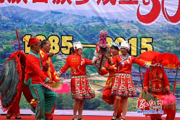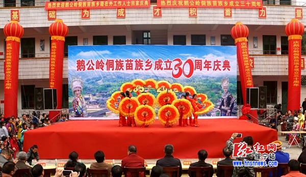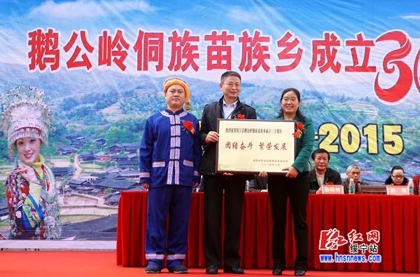 红网绥宁站11月24日讯(分站记者 王伟琪)苗歌飞扬,万民同乐。11月23日,邵阳市绥宁县鹅公岭侗族苗族乡群众载歌载舞,欢庆该乡成立30周年。湖南省祝贺团团长、省民宗委宗教一处处长柏恒,邵阳市祝贺团团长、市地税局总会计师李源辉,绥宁县祝贺团团长、县人大常委会主任梁晓明分别率省、市、县祝贺团到场对鹅公岭侗族苗族乡成立30周年表示祝贺。风雨兼程三十载,绥宁县鹅公岭侗族苗族乡发生了翻天覆地变化,经济社会等各项事业取得了骄人的成绩,该乡特色产业生姜、辣椒、油茶、绞股蓝、青钱柳等特色农作物,远销北京、上海、广州等城市,是有名的“双辣之乡”。柏恒代表湖南省民族宗教事务委员会向鹅公岭侗族苗族乡赠送了写有“团结奋斗,繁荣发展”牌匾。省、市、县祝贺团对鹅公岭侗族苗族乡30年来团结奋斗,锐意进取,坚持优势资源开发与保护并重,推动民族乡农民增收、产业发展,社会各项事业取得长足发展,人民生活水平不断提高给予了充分肯定。并和鹅公岭侗族苗族乡群众一起观看了具有当地特色的民俗文化表演。