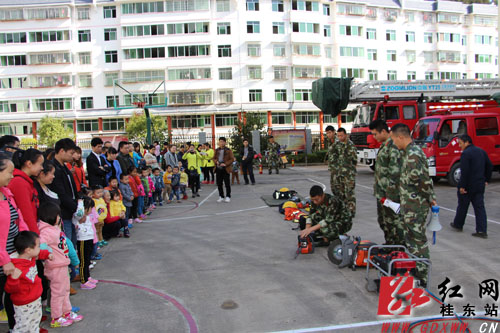红网桂东站11月24日讯(通讯员 张强)11月22日,桂东新星幼儿园50余名小朋友在老师和家长的陪同下走进桂东消防大队警营,进行参观体验,加深师生、家长和幼儿园小朋友们对消防工作认识,学习消防知识。活动中,小朋友们在讲解员的带领下先后参观了执勤车辆,装备器材,面对琳琅满目的消防装备器材,并在官兵的指导下试穿了消防战斗服。随后,教师、家长和小朋友们观看官兵示范表演了灭火器的使用,聆听中队官兵讲解移动水炮、排烟机、金属切割机等器材的名称、用途和使用方法。家长、老师还现场学习了灭火器的使用。