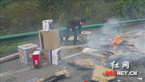 当天上午11时左右,一辆湘B牌照的货车行驶在沪昆高速西往东方向1015公里处时,驾驶人从反光镜中看到车身冒烟,赶紧靠港湾停车查看。原来是车上货物起火了,驾驶人赶紧报了警。