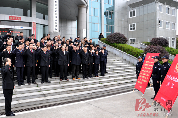 庄严的国旗下,由院党组书记、代院长陈勇领誓,君山法院50余名干警向宪法宣誓
