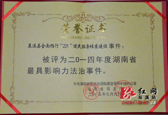 红网辰溪站12月8日讯(分站记者 杨剑 通讯员 米宝 黄始喜 张凯)12月7日,笔者从辰溪县委法治办获悉,在刚刚闭幕不久的2014年度最具影响力法治人物、法治事件颁奖仪式上,辰溪县“221”便民服务体系建设荣获2014年度湖南省最具影响力法治事件。辰溪县委常委、政法委书记谢开翰从省委法治办常务副主任、省司法厅厅长谈敬纯手中接过获奖证书。这是该县荣获全国法治县(市区)创建活动先进单位后获得的又一殊荣。为规范权力运行,方便群众办事,从2014年开始,辰溪全面推行了“221”便民服务体系建设,即建好三级联动、乡镇民情信息两大服务平台,畅通党员干部代办群众事务、乡镇干部联村统包两条渠道,健全便民服务流程、监督考核等一套长效管理制度。“221”便民服务体系运行1年多来,共为3万余人次提供了网上政务咨询服务,党员干部累计代办群众事务2万多项、收集群众意见建议2500余条,帮助群众解决各类实际困难1万多次,2000多起矛盾纠纷得以及时化解。2014年底,省委法治湖南建设领导小组办公室、湖南省司法厅启动了2014年度湖南省最具影响力法治人物暨法治事件评选活动,辰溪县全面推行“221”便民服务体系从300多件法治事件中脱颖而出。2015年6月,辰溪“221”便民服务体系成功入选全省“十大法治事件”。