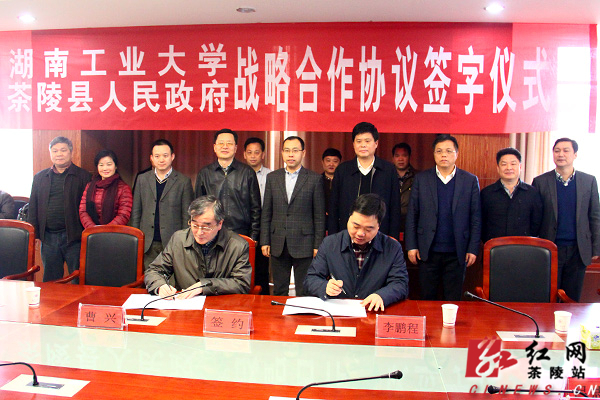 红网茶陵站12月8日讯(分站记者 吴清远)12月7日,茶陵县政府与湖南工业大学战略合作签约仪式在湖南工业大学举行。株洲市副市长毛朝晖,茶陵县委书记彭新军,县委常委、常务副县长李鹏程,副县长陈艳娟等领导参加签约仪式。签约仪式在科技楼会议室举行。“今天的签约,标志着双方合作实现了由点到面、由项目合作到战略合作的转变。”彭新军在签约中表示,茶陵将以开放的姿态,发展的眼光,为湖南工业大学的创新发展,提供更广阔的教学科研、实验实习、红色教育、旅游休闲基地和空间。他认为,此次合作可以拓展湖南工业大学科技成果转换的新途径,可以拓展“产学研”相结合的新道路,也为茶陵的发展增加新的动力,注入新的活力。希望双方共同走出一条校县资源互享、优势互补、发展互助、互惠共赢的新路子。