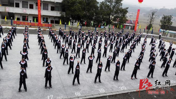 红网桃江站12月10日讯(通讯员 谢平方 罗志大)12月8日上午,桃江县三堂街镇乌旗山中学操场上,近300名学生铿锵有力的“嘿、哈”声不时响起,出拳时而刚劲有力,时而飘逸洒脱,既有传统武术的动感,又有韵律操的美感。学生动作一丝不苟,裁判员根据标准打分。当日,该校迎来了县教育局、体育局联合举办的桃江县中小学阳光体育大课堂暨武术健身操比赛。为贯彻落实中共中央、国务院《关于加强青少年体育增加青少年体质的意见》等相关文件精神,大力弘扬民族传统体育,促进青少年阳光体育运动广泛开展,保障青少年达到每天锻炼一小时,桃江县在全县中小学校开展了阳光体育大课堂暨武术健身操比赛活动。活动分两个阶段进行,第一阶段由各乡镇中心学校在11月份之前自行开展检查评比,同时上报参评单位名单;第二阶段从12月3日到9日,相关部门派出3个检查组,对全县15个乡镇46所学校检查评比并录像,根据现场检查打分与录像,合议进行综合评等,并给予表彰奖励。