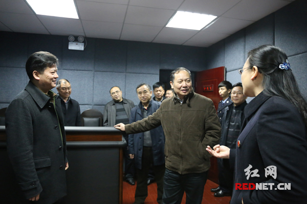首建中书记(前中)视察汝城检察院办案工作区,并与干警亲切交谈。