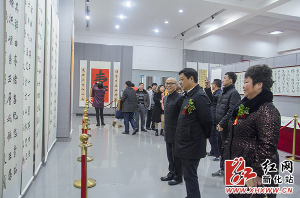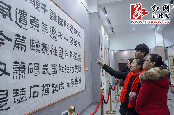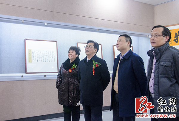 新化县委书记胡忠威(左二)、县委常委、宣传部长李劲柳(左一)、副县长李南新(右一)等观看书法展
