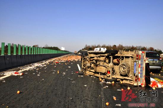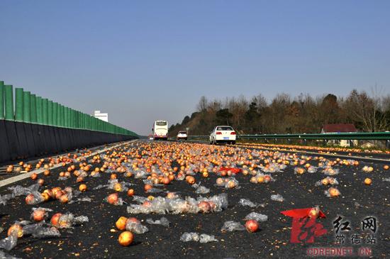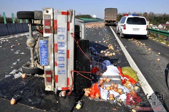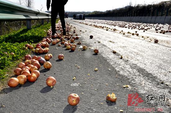 红网常德站12月18日讯(分站记者 郑江晖)12月17日下午2点半左右,在二广高速东常段南往北1893千米+200处,一辆满载苹果的小货车侧翻,两千斤苹果铺满路面。“一辆大货车从旁边快速超车,我一时间方向盘没握稳,就侧翻了。”车主张先生一行三人远从河南来到湖南兜售苹果,所幸事发时自救及时,张先生并未受伤,不过满满一车苹果损失上万元。