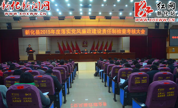 红网新化站12月23日讯(分站记者 王彬)12月21日,新化县召开2015年度落实党风廉政建设责任制检查考核大会。会议由新化县委副书记、县长邓光吕主持,新化县委书记胡忠威就新化县委履行党风廉政建设主体责任工作作汇报并作述责述廉报告,县委常委、县纪委书记刘岚平就新化县纪委监察局履行党风廉政建设监督责任工作作报告。市领导徐勇、曾福泽,县领导周海强、刘学明、刘巩成、姜世星、陈创业、王汪、李劲柳、杨韶红、王文红、王勇、朱国飞等全体在家县级干部参加会议。参加会议的还有县法院、县检察院及县纪委监察局班子成员,县直机关、企事业单位、人民团体和各民主党派主要负责人,各乡镇负责人及部分党代表、人大代表、政府委员、党风监督员和离退休老同志代表。