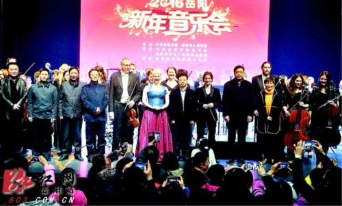 红网岳阳站1月4日讯(分站记者 欧梁 黄梅)12月31日,“2016年新年音乐会”在岳阳文化艺术会展中心奏响,来自德国柏林电影爱乐乐团的艺术家们献上了一场新年音乐盛宴。这也是岳阳高雅艺术惠民演出的第60场。市委书记盛荣华,市委常委、组织部长、统战部长王瑰曙,市委常委、岳阳军分区政委张作坤等市领导共同欣赏了这场音乐盛会,并在演出结束后登台与艺术家们握手,祝贺演出成功,共迎新年到来。盛荣华希望艺术家们多到岳阳走走看看,感受岳阳的城市之美,领略洞庭风光。音乐会以热烈欢腾的管弦乐《蝙蝠序曲》开场,气势磅礴的交响乐一下吸引住了观众。乐团除演奏了一些国外经典曲目如《斯拉夫舞曲》、《蓝色多瑙河》等外,还表演了《梁山伯与祝英台》、《红色娘子军》选段等观众耳熟能详的中国乐曲,女声独唱女高音伊瑟为整场表演增色不少。最后一曲《蓝色多瑙河》结束后,观众还沉浸在高雅的音乐里,久久不愿离去,最后用雷鸣般的掌声和欢呼声请上乐团返场演奏了《拉德斯基进行曲》和中国经典乐曲《茉莉花》,熟悉的旋律赢得观众阵阵掌声。