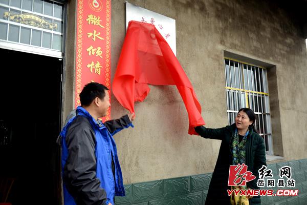 岳阳县委常委、宣传部长喻飞跃与爱心协会会长刘冬平为“爱心屋”揭牌。