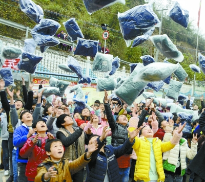 时刻新闻 —分享— 1月11日,永顺县润雅乡九年制学校,学生们开心地抛洒刚领到的新衣。当天,该县总工会、团县委开展“精准扶贫进校园,温暖润雅青少年”的爱心关爱活动,为学校的450名学生送来暖冬棉衣。刘文化 摄 来源:湖南日报 编辑:王娉娉