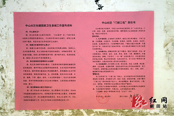 红网新田站1月14日讯(分站记者 钟伟锋 左富姣)1月13日,新田县龙泉镇中山社区组织网格员和后盾单位,深入区域内沿街门店,逐户进行创卫宣传,并与其经营主签订“门前三包”责任书。门面三包:即包市容秩序、包环境卫生、包设施看护。各门店经营户签订“门前三包”责任书后,应自觉维护门前秩序,保持门前干净整洁,看护好门前的垃圾桶、交通标识牌等市政公用设施,也有责任和义务劝阻和制止未经批准擅自损毁、偷盗公用设施等行为。当天,门店经营户与工作人员达成不需商讨的共识,纷纷签订了“门前三包”责任书,并表示将自觉按照责任书要求,共同维护好社区的环境,营造一个干净、整洁、文明、舒适的经营居住环境,为创国卫尽自己的一份力。