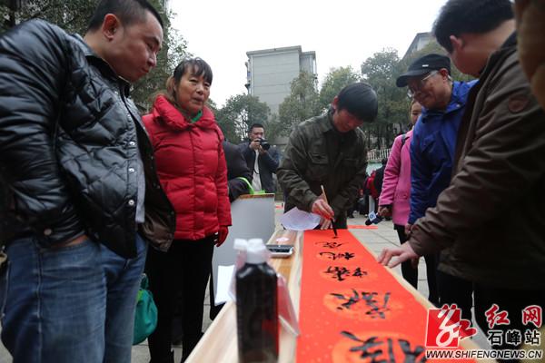 红网石峰站1月17日讯(通讯员 龙中柱)1月16日,由衡阳市石峰区委宣传部、区文联、各街道主办的“‘我们的中国梦’—文化进万家”石峰区名家送春联和送全家福惠民志愿服务活动正式启动,首场在北岭社区和新民社区举行,吸引附近居民纷纷来排号领取春联。活动当天,叶剑平、申明等18名书法家当场挥毫泼墨为市民书写春联,张湘东、彭侃2位摄影家为社区居民拍全家福。