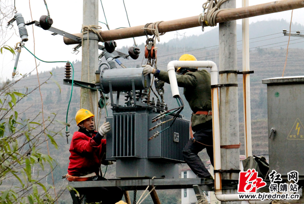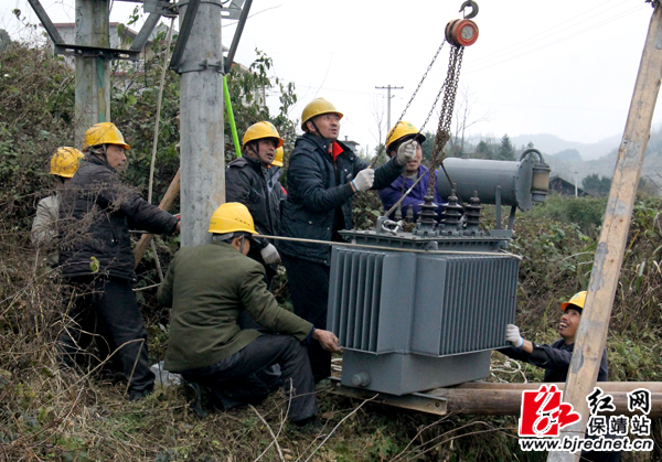 红网保靖站1月19日讯(通讯员 俞采华 曹彪)1月17日,国网保靖供电公司的职工在清水坪镇塘棚村更换变压器,保村民春节期间正常用电、安全用电、安心用电。春节临近,全县10多万名外出务工人员陆续返乡过年,空调、电暖灯、电磁炉等家用电器的集中使用给当地农村电网造成负荷压力。为了满足春节期间农村用电需求,该供电公司全力备战春节保电,启动县、乡、村三级服务体系,提高农村电网的供电能力。