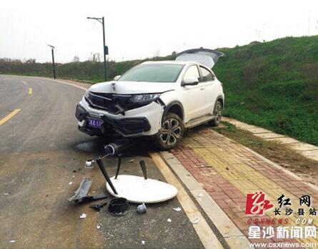 昨日上午,在松雅湖环湖路东一线入口处左拐大概700米处,记者看到,一辆白色SUV“骑”在了路边的路灯柱上。该车车头部分损毁较为严重,引擎盖中间凹了进去,车灯和前保险杠被撞毁;汽车零件的碎片,连同被损毁路灯部件散落一地,让人看了触目惊心。