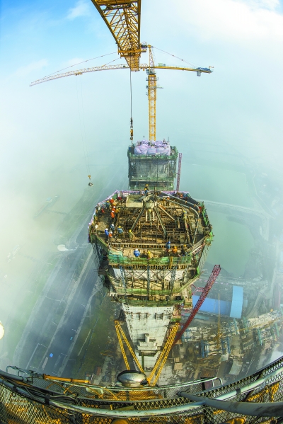 大岳高速洞庭湖大桥A1标索塔于1月15日胜利封顶。索塔采用门式框架结构,塔高203米。 陈浩 摄