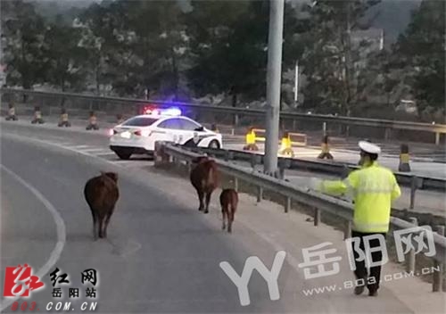 1月24日16时许,高速交警临湘大队民警接到过路司机报警称:有三头牛在大岳高速和京港澳高速互通上乱跑,严重影响到高速公路的正常通行。接到报警后,民警迅速赶往现场,只见两头大水牛和一头小水牛在京港澳高速应急车道上逆行“散步”,后方来车纷纷避让,险象环生,情形相当危急。