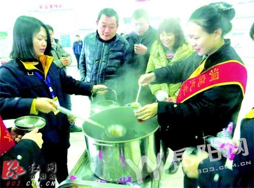 洞庭汽车站里,志愿者们为候车旅客送上一碗碗热腾腾的红糖姜茶,让旅客温馨踏上归乡路。 记者 李 婷 摄