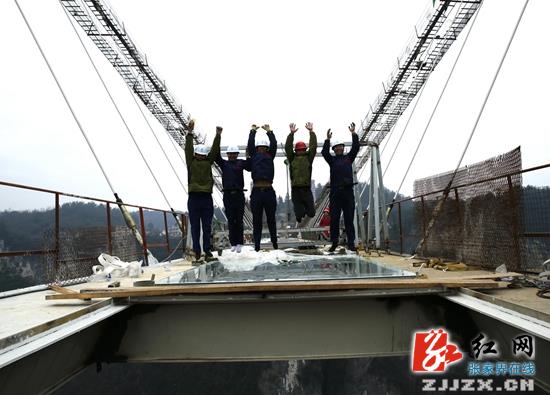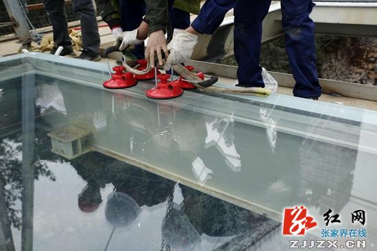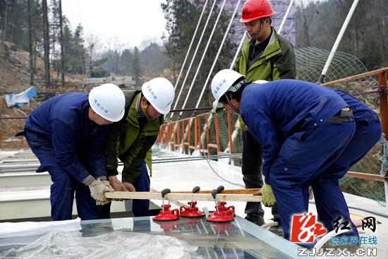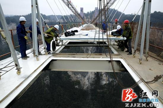 红网张家界站1月27日讯(通讯员 罗克文 吴勇兵)1月27日,张家界大峡谷玻璃桥桥面玻璃首装成功。整个桥面将铺设99块厚约5厘米的全透明夹胶玻璃。其中长4.2米、宽3.05米的玻璃75块,其他不规则玻璃24块。预计两周内完成全部玻璃铺设,整个玻璃面的承载量至少达60吨。张家界大峡谷玻璃桥总长430米、宽6米,桥面距离谷底相对高度约300米,以世界最长、世界最高、世界首座玻璃作为主受力结构的大型桥梁等十项“世界之最”成为国际桥梁建设的典范。预计今年“五一”前面向全球公众开放。