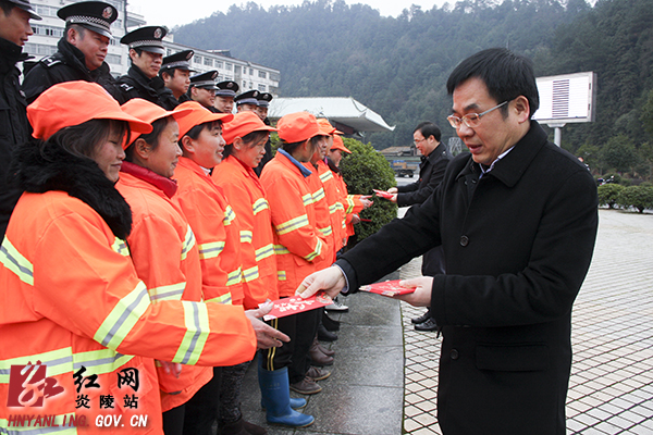 红网炎陵站1月27日讯(分站记者 史天军)1月27日,炎陵县委书记黄诗燕,县委副书记、代县长文专文走访慰问春节民生保障部门,向他们致以节日的问候,并要求各部门强化调度,坚守岗位,确保群众度过一个平安祥和的春节。“大家辛苦啦!在春节即将到来之际,县委、县政府主要领导一起来看望大家,给大家拜个早年,祝大家及家属新年快乐、万事如意、一切都好。”在县中心广场,黄诗燕依次看望慰问了坚守在一线的公安民警、交警、城管、环卫工作人员,向他们致以新春的美好祝福。他指出,城管和环卫工作人员为炎陵城市的文明、干净、美化和亮化做出了巨大贡献,希望大家继续发扬特别能吃苦、特别能奉献的精神,把县城管理得干净、整洁、平安。过去一年,广大公安民警奋战在一线,为炎陵的经济发展、社会稳定做出了重要贡献,希望大家再接再厉,把炎陵管理的更好,为确保社会稳定和老百姓安居乐业,再立新功,让老百姓快快乐乐、欢欢喜喜过一个春节。