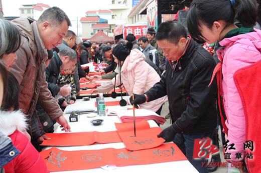 红网宜章站1月28日讯(分站记者 李茁 李明华)“今天我领了3副春联,书写的春联比买的好看多了,太感谢他们了。”宜章岩泉镇居民李新莲笑着说。1月26日,宜章县委宣传部、县文联、县文体广新局联合举行“文化进万家·送福送春联”活动,营造了一种祥和愉悦的节日氛围。此次活动首站来到宜章县岩泉镇集市,活动现场人潮涌动,翰墨飘香,来自宜章县书画协会10余名书法家挥毫泼墨,免费为群众书写春联,一句句吉祥如意的春联,为即将来临的春节增添了浓浓的喜庆氛围,当天共送出春联1000余副,深受群众喜爱。同时,莽山艺术团有限公司文艺工作者为群众送上了一台精彩的文艺表演,演出的节目贴近群众生活,精彩的舞蹈《金猴闹春》、花鼓表演唱《婆媳贤》、快板小品《四老倌批邪教》等10余个节目赢得了广大群众的阵阵喝彩。新华书店工作人员还搭设了临时书篷,为当地群众送书阅读。