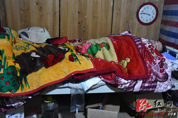 如今,杨盛海夫妇和小儿子一家挤在一栋木房子里。房子年久失修,四处漏风,杨盛海便用塑料薄膜挡着,用报纸遮着。寒风刮着薄膜飒飒作响,伴着这声响,寒风在房内肆意嬉闹,给杨盛海一家送来寒冬独有的冰冷。因为长期卧床,插着导尿管,小儿子经常尿路感染。无钱医治,儿媳便久病成医,自己给丈夫打针、喂药。