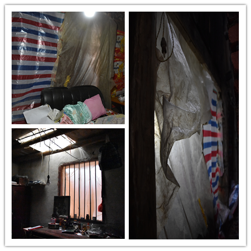 杨盛海四处透风的家。一面墙因年久失修已经垮了,杨盛海简单地用塑料薄膜挡着。 何嫘/摄
