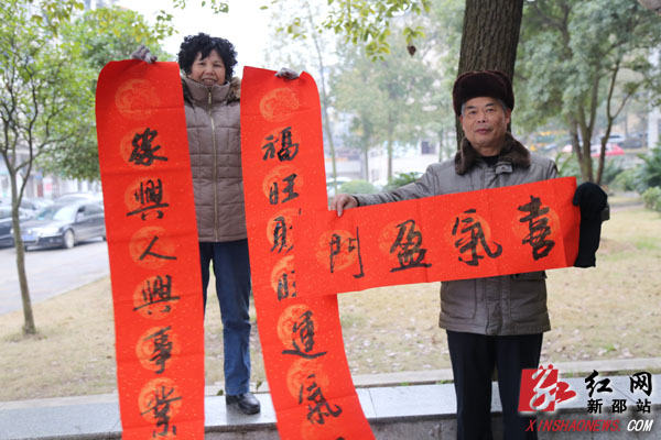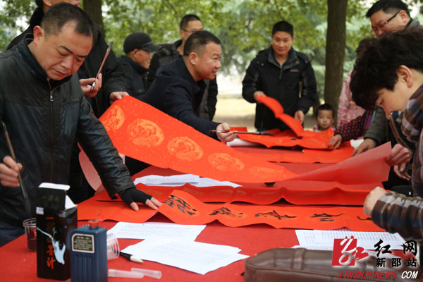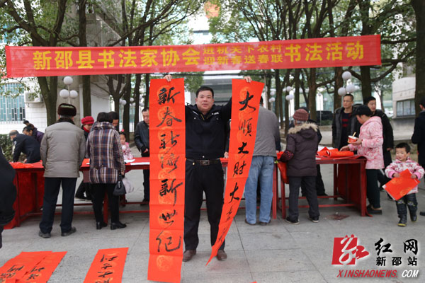 红网新邵站1月29日讯(通讯员 何雯)“好!漂亮!真是大家风范啊!”1月29日上午,一阵阵叫好声不时的从新邵县委大院内传来。原来新邵县书法家协会“进机关下乡村迎新春送春联”活动在此举行。只见众多书法爱好者现场欣然提笔挥毫泼墨,现场里三层外三层围满了争先恐后求对联的群众,一幅幅或遒劲飘逸或行云流水的喜庆对联在人们的期待中诞生了。新邵县书法家协会自2007年成立至今,这种“迎新春、送春联”的活动已经连续举办了十年,每次为群众书写春联达200幅以上,从未间断,深受广大群众的喜爱和好评。