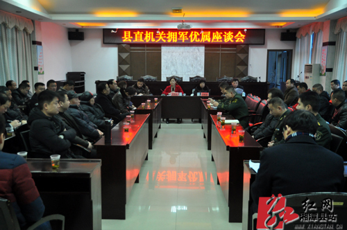 红网湘潭县站2月1日讯(分站记者 杨建)2月1日,湘潭县直机关拥军优属座谈会在县民政局召开,县领导周艳希、何晓春、杜孟洋及县民政局负责人、驻县部队、军队离退休干部,烈、军属,荣、复、转、退军人等欢聚一堂,畅叙军民鱼水情,共迎新春佳节。座谈会上,县民政局负责人就2015年拥军优属工作及2016年拥军优属的整体工作思路作出报告。