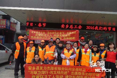 当天,安乡县总工会、安乡县发力志愿者服务队组成爱心联盟志愿服务队,联合开展“我们的节日·春节”之“关爱环卫工人、共建文明安乡”志愿服务主题活动,分赴县城各街道,以集中和分散发放形式,为县城区315名环卫工人送上“温暖礼包”,给坚守在工作岗位上的环卫工人送上了新年祝福和节日问候。