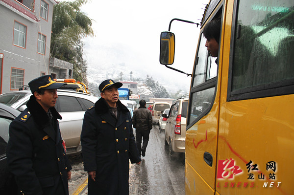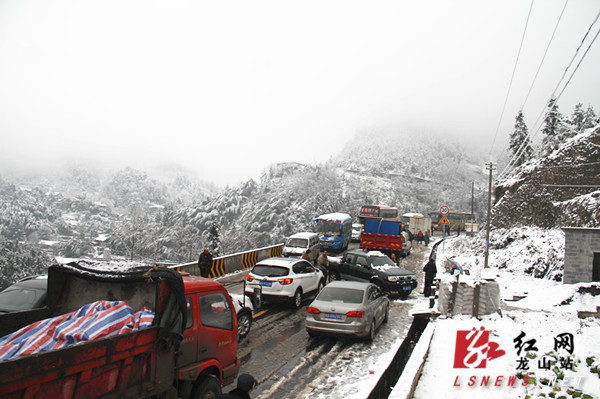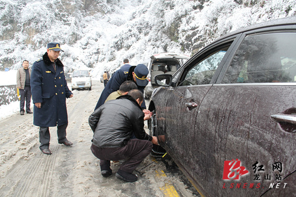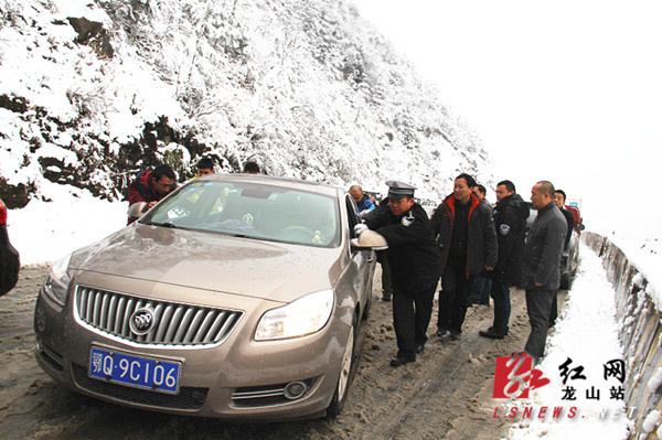 红网龙山站2月1日讯(分站记者 胡域)1月31日,受低温大雪影响,龙山县境内的交通干线开启速冻模式,S305省道望乡台路段千余车辆滞留。县委常委、县委办主任符家波在前往茨岩塘镇细车村走访的途中受阻后,立即与交警、路政人员一起疏导交通,2小时后,道路终于疏通。记者在现场看到,一夜的大雪后,山野白茫茫一片,冰凌满枝,有的地方覆盖积雪达15厘米。公路上的积雪和冰层已无法满足车辆通行的条件,近千余辆车被分别滞留在半山腰和山下进退两难。一辆粤字牌照的小车横摆在道路中间,交警获知原因后,立即从山下调来防滑链条,并帮助小车司机安装好防滑链条。路政人员对受降雪结冰影响较大的路段采取机械与人工铲雪破冰、抛散防滑料的方式,全面开展除雪防滑工作,并在险要路段设置安全警示标志,提醒过往的行人谨慎注意安全。交警及时指挥、提醒、疏导,尤其是遇上车辆打滑难行时,众人齐心协力推车,上演了几场“推车秀”。在堵车的2个多小时内,车流平稳、有序,没有出现交通事故。