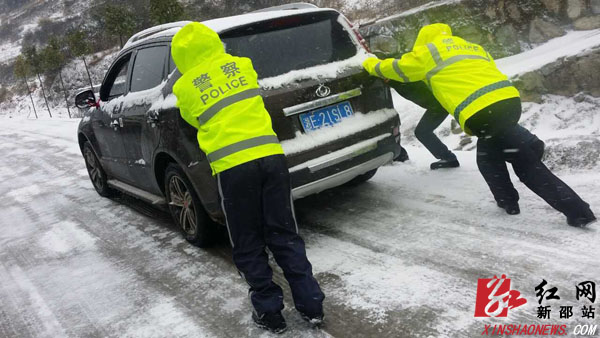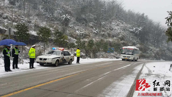 红网新邵站2月1日讯(分站记者 隆清泉 通讯员 邓凭凭)1月31日晚上21时许,新邵县公安局交警大队龙溪铺中队值班民警在巡查中发现:龙溪铺镇全境道路被突如其来的暴雪覆盖,特别是217省道牛山卡路段路面已经结冰。中队长立即召集轮休的同志驱车奔赴抗雪的前线。民警到达现场后发现形势很严峻,当时气温已经降至零下5度,温度还在继续下降,已经发生了几起因路滑引起的车辆碰撞事故。民警马上把了解的情况跟镇政府、大队领导、公路部门汇报,请求部门联动,采取有效措施。民警连夜设立警示牌、警示标志,沿线巡逻喊话提醒过往司机小心慢行。时间走到了2月1日凌晨四点,积雪已经超过十厘米,气温已经接近零下十度。大雪没有丝毫停下的意思,且被牢牢冻在路面,牛山卡路段完全不能通行。民警果断在牛山卡路段两端设卡封路,放置警示锥筒,开亮警灯,阻止车辆通行。