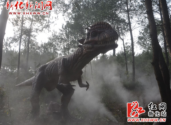 红网新化站2月3日讯(分站记者 王彬)2月2日,新化县梅山生态恐龙园正式揭牌开园,翼龙、霸王龙等50多只仿真恐龙栩栩如生,或动或叫,现身园内丛林之中,为游客展现一幅神奇的史前画卷,让游客穿越回侏罗纪时代巨型生物真实生活环境。梅山生态恐龙园位于新化县油溪乡梅山龙宫,投资两千多万元,2015年8月开始动工,2月2日正式开园。是湖南省内唯一一家恐龙主题生态公园,园内分成五大区,分别是侏罗纪仿真恐龙观赏区、恐龙化石展览区、7D恐龙影院、儿童活动乐园及恐龙狩猎英雄游乐区。