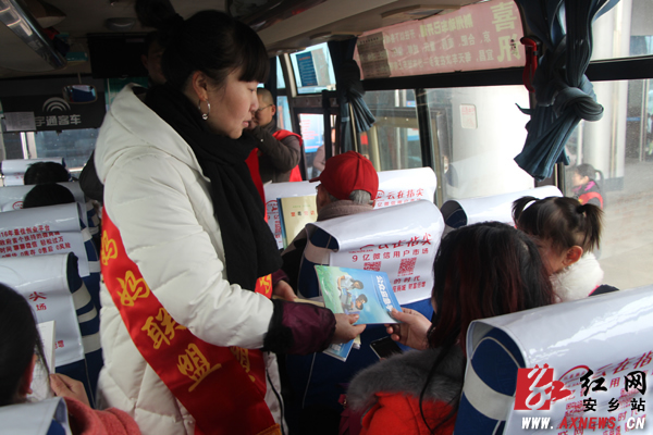 红网安乡站2月3日讯(分站记者 胡毅)为充分利用外出人员返乡探亲、过节的有利时机,深入推进全县禁毒和应急宣传工作,2月2日上午,安乡县禁毒办、应急办、公安局、教育局、妇联、团县委、总工会等禁毒成员单位在子龙车站开展了2016年度新春返乡人员禁毒和应急知识集中宣传活动。此次宣传活动,“安乡禁毒志愿者服务队”“安乡县禁毒妈妈联盟”等宣传队伍发挥了宣传主力军作用。参加宣传人员走进售票候车大厅、走上客运车辆,向广大旅客发放禁毒宣传、应急知识等相关资料。活动还通过摆放宣传展板、播放禁毒公益广告等形式,向广大旅客宣讲了相关法律常识及防毒知识。