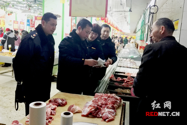 执法人员正在对超市出售的鲜肉进行检查。