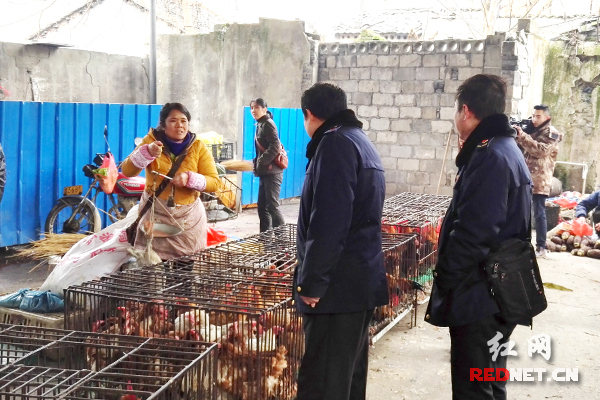 执法人员正对集贸市场出售的禽类进行检查。