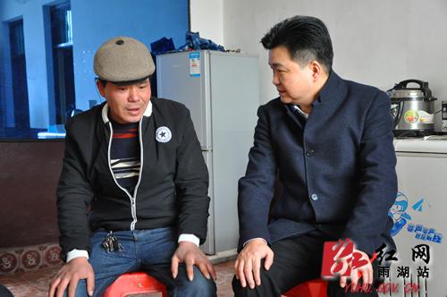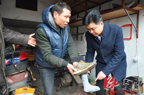 雨湖区委副书记、区长何锋(右)查看赵焕明腿部疾病情况