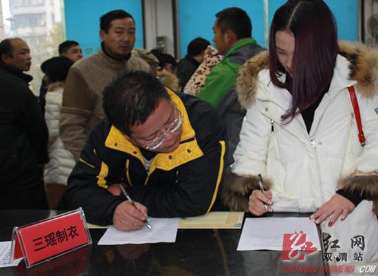 应聘人员在三瑶制衣展台前填写就业信息