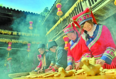 大年初一傍晚,江华瑶族自治县湘江乡庙子源村香草源组瑶胞游建民与妻子赵财凤按照传统习俗,忙着做馃子:把糯米舂成泥,捏成鱼、猴等形状,寓意年年有余、金猴献瑞。然后下油锅炸至金黄,再把炸好的馃子涂上从山间采来的冬蜜。既营养又可口。