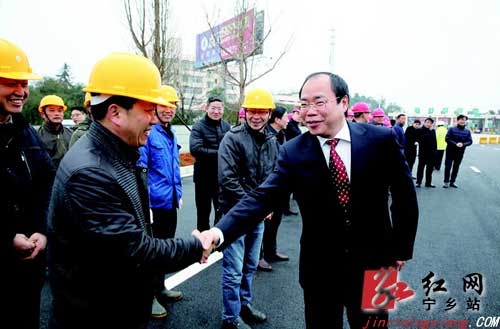 宁乡县委书记谭小平(右)在与建设者们一一握手。