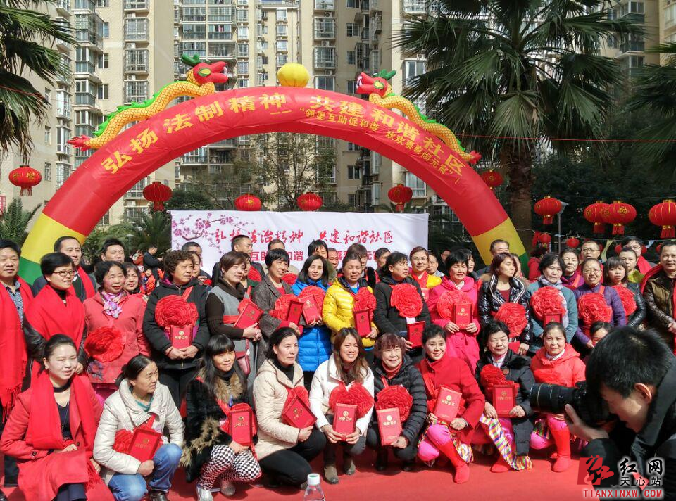红网天心站2月22日讯(通讯员 宋敏)元宵节是中国的传统节日之一,为活跃节日气氛,丰富社区居民的文化生活,让居民在欢乐、祥和的氛围中度过元宵佳节,今天上午,长沙天心区金盆岭街道赤岭路社区携手长沙市法制办在金碧文华小区开展“弘扬法治精神,共建和谐社区”元宵节活动,为居民群众呈上了一场精彩的元宵盛宴。此次活动由市法制办、区文明委主办,区文明办、金盆岭街道办事处及金碧文华小区第三届业主委员会承办,市、区文明办领导出席了此次活动。一曲腰鼓舞掀起了此次活动的热潮,活动首先由金盆岭街道工委书记周文辉为本次元宵节主题活动致辞。本次活动内容包括文艺表演、邻里互动游戏、表彰优秀志愿者、为居民送法制书籍、吃汤圆五大部分,并融入猜灯谜、趣味游戏等与居民群众互动的活动环节。