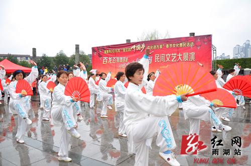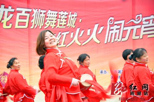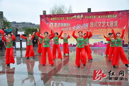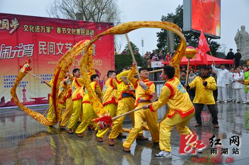 展演中,来自雨湖区各乡镇街道以及白石健身辅导站的15支优秀文艺队伍纷纷拿出自己的看家本领,为群众奉上了舞龙、腰鼓、太极拳等一道道精彩的民间文艺大餐,博得了现场群众的阵阵掌声。万楼街道舞龙队登场时,一群年轻小伙子将蛟龙舞得时而翘起尾巴直冲云端,时而俯首直冲入海破浪,把“团龙起伏”“八字舞龙”“穿龙尾接跳龙起伏”等绝技展现得淋漓尽致,他们用如火的热情装点着元宵胜景,将演出推向了一个高潮。